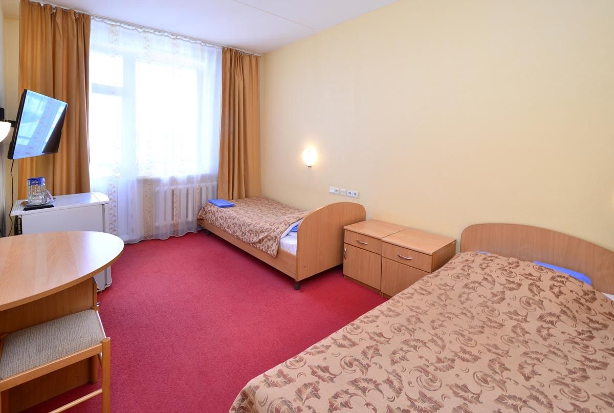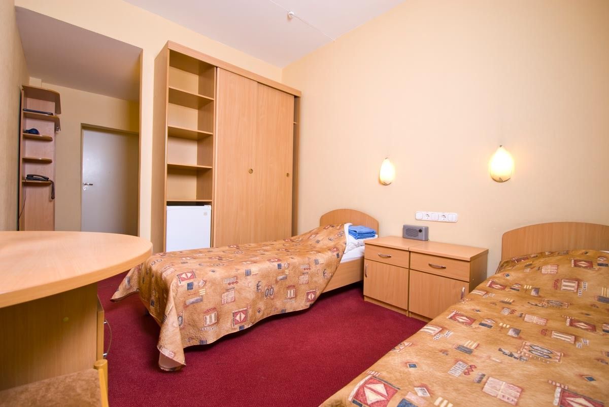 Оборудование номера: две односпальные кровати, прикроватные тумбочки, шкаф для одежды, стол со стульями, телевизор, холодильник, электрочайник, телефон