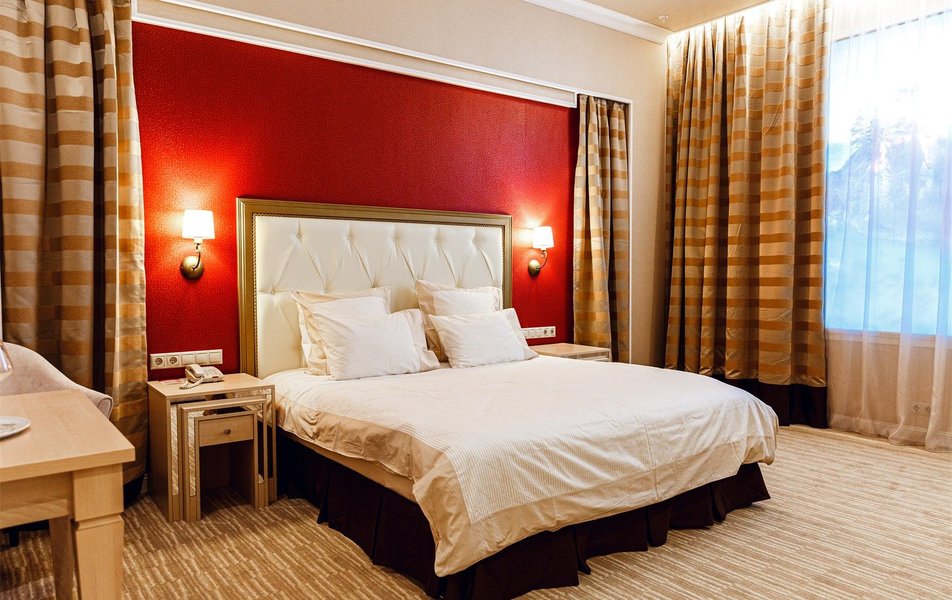 В номере: вешалка, зеркало, кровать двуспальная, прикроватные тумбочки, стол, стулья, шкаф, кондиционер, сейф, телевизор, телефон, холодильник