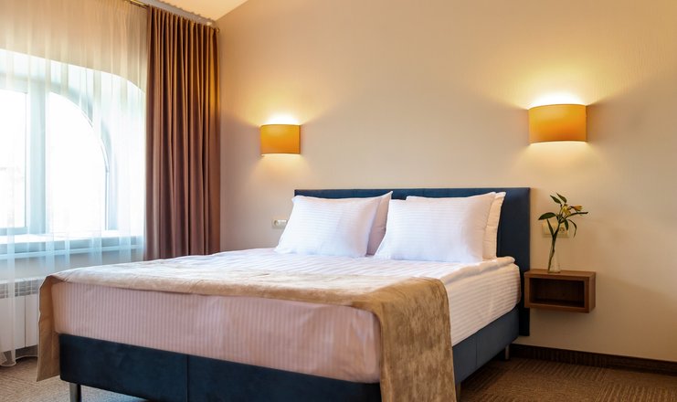 В номере: вешалка, кресло, кровать двуспальная, прикроватные тумбочки, стол, стулья, шкаф, кондиционер, телевизор ЖК, телефон, холодильник, чайный набор посуды, электрочайник